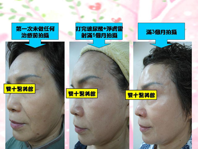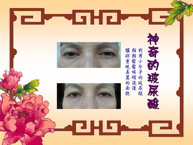玻尿酸具有黏容性與伸縮性,是一種非常理想的填充物質。玻尿酸應用於注射除皺整形上,以「填充式」的原理,注射於真皮組織中,能修飾深淺不同的凹陷皺紋及填充豐滿之臉頰、嘴唇、下巴與雕塑鼻形等多種功能。
